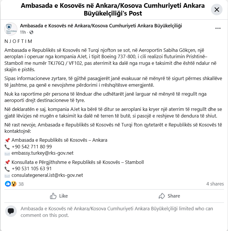 “Ambasada e Republikës së Kosovës në Turqi njofton se sot, në Aeroportin Sabiha Gökçen, një aeroplan i operuar nga kompania AJet, i tipit Boeing 737-800, i cili realizoi fluturimin Prishtinë–Stamboll me numër TKJ76Q / VF102, pas aterrimit ka dalë nga rruga e taksimit dhe është ndalur në skajin e pistës. Sipas informacioneve zyrtare, të gjithë pasagjerët janë evakuuar në mënyrë të sigurt përmes shkallëve të jashtme, pa qenë e nevojshme përdorimi i rrëshqitësve emergjentë. Nuk ka raportime për persona të lënduar dhe udhëtarët janë larguar në mënyrë të rregullt nga aeroporti drejt destinacioneve të tyre. Në deklaratën e saj, kompania AJet ka bërë të ditur se aeroplani ka kryer një aterrim të rregullt dhe se gjatë lëvizjes në rrugën e taksimit ka dalë në terren të butë, si pasojë e reshjeve të dendura të shiut”, ka njoftuar Ambasada e Kosovës.