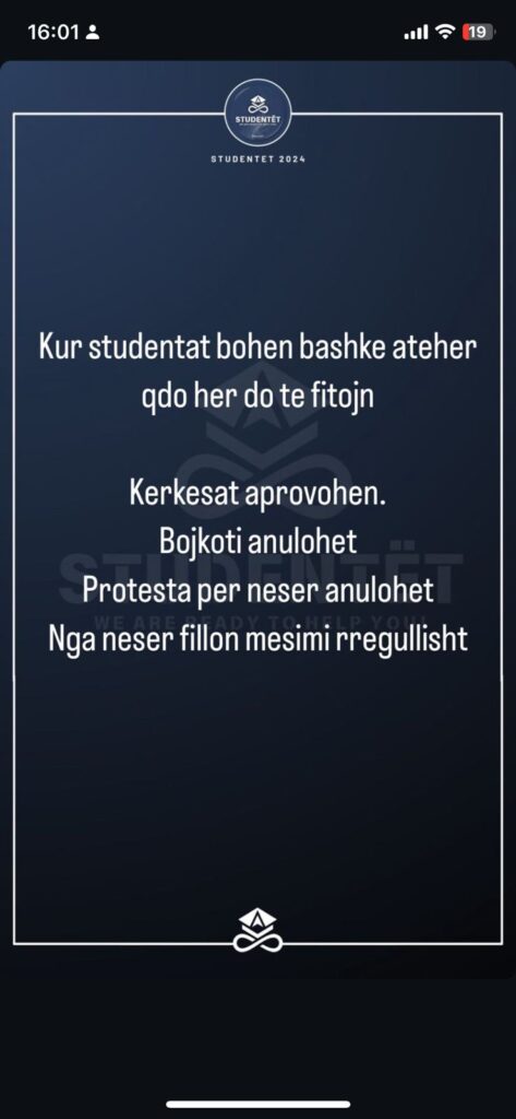 “Kërkesat aprovohen, bojkoti anulohet. Protesta për nesër anulohet, nga nesër fillon mësimi rregullisht.”, thuhet në një instastory në instagramin “studenti”./LapsiInfo