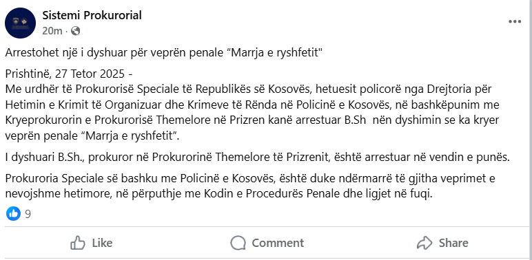 Me urdhër të Prokurorisë Speciale të Republikës së Kosovës, hetuesit policorë nga Drejtoria për Hetimin e Krimit të Organizuar dhe Krimeve të Rënda në Policinë e Kosovës, në bashkëpunim me Kryeprokurorin e Prokurorisë Themelore në Prizren kanë arrestuar B.Sh nën dyshimin se ka kryer veprën penale “Marrja e ryshfetit”.