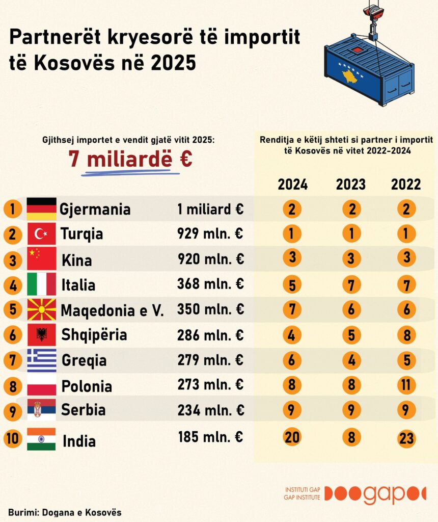 Instituti GAP ka publikuar një grafik me të dhënat për partnerët kryesorë të importit të Kosovës për vitin 2025. Sipas GAP-it, këto të dhëna janë siguruar nga Dogana e Kosovës.