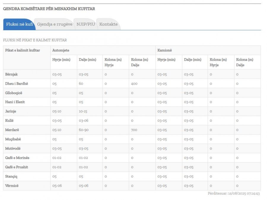 Sipas këtyre përditësimeve, nëpër të gjitha pikat e tjera kufitare sikurse në hyrje ashtu edhe në dalje të Kosovës pritja më e madhe është nga 5 deri në 10 minuta.