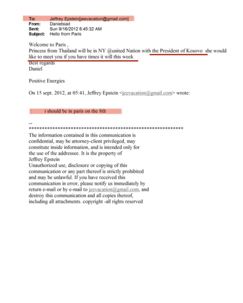 Në korrespondencat e zbardhura, një bashkëpunëtor i afërt i Epstein-it njofton pedofilin amerikan se princesha e Tajlandës kërkonte një takim në Nju Jork, ku do të ishte i pranishëm edhe “Presidenti i Kosovës”. Megjithatë, në atë kohë Pacolli mbante postin e zv/kryeministrit dhe jo të presidentit.