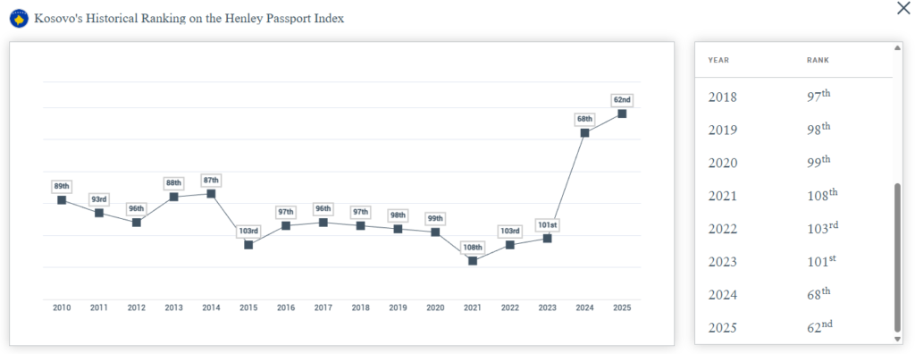 Rritja në renditje tregon një përparim gradual në lëvizshmërinë ndërkombëtare të kosovarëve, ndonëse pasaporta e Kosovës mbetet ende pas shumicës së vendeve të rajonit.