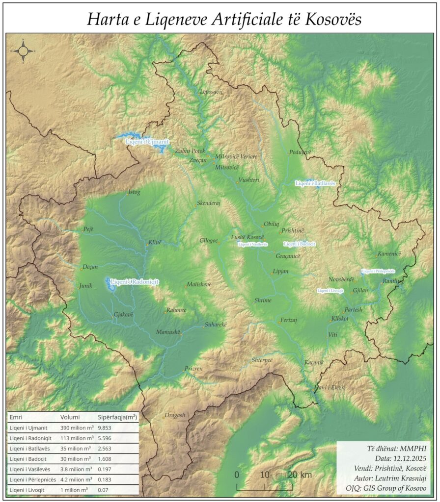 Grupi GIS i Kosovës (GGK) ka publikuar një hartë tematike që tregon liqenet artificiale kryesore në vend dhe kapacitetin e tyre ujor, duke nxjerrë në pah sfidat e qëndrueshmërisë afatgjate të burimeve ujore.
