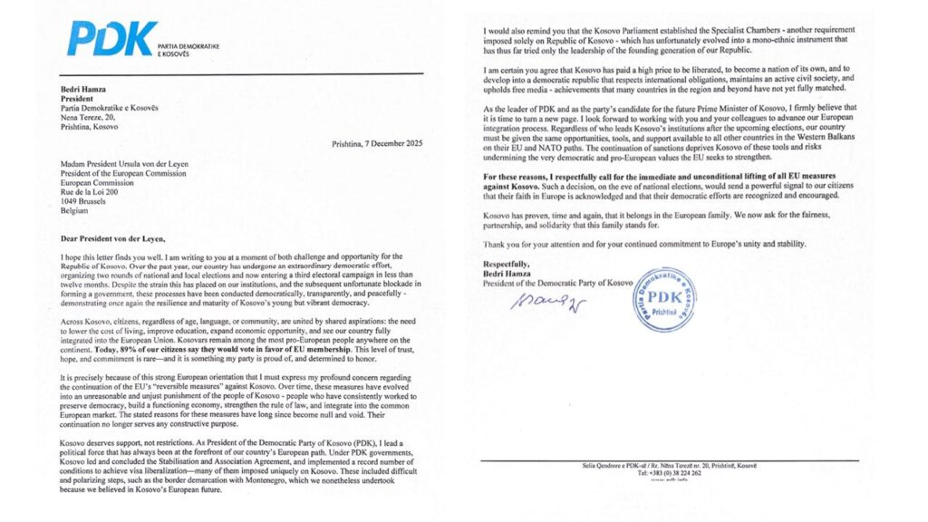 Kryetari i Partisë Demokratike të Kosovës (PDK) Bedri Hamza, ka njoftuar se i është drejtuar me një letër presidentes së Komisionit Evropian, Ursula von der Leyen dhe institucioneve të BE-së, me të cilën ka kërkuar heqjen e masave ndaj Kosovës.