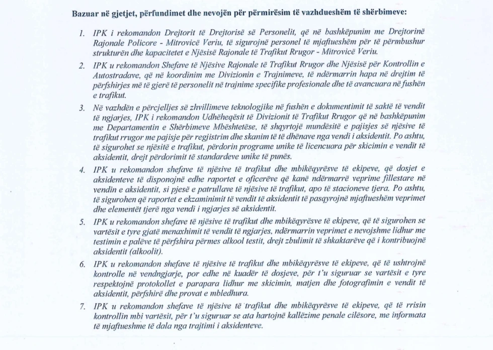“IPK-ja u rekomandon Shefave të Njësive Rajonale të Trafikut Rrugor dhe Njësisë për Kontrollin e Autostradave që në koordinim me Divizionin e Trajnimeve, të ndërmarrin hapa në drejtim të përfshirjes më të gjerë të personelit në trajnime specifike profesionale dhe të avancuara në fushën e trafikut”, thuhet në mesin e shtatë rekomandimeve.