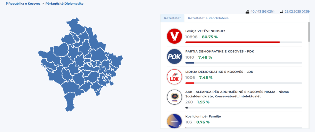 Sipas të dhënave të fundit, të përditësuara sot (28 shkurt) në ora 07:59, del se Lëvizja Vetëvendosje ka marr 80.75 për qind, ose 10.898 vota, transmeton Klankosova.tv.