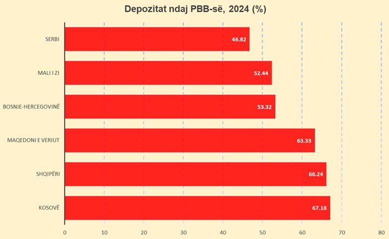Të dhënat krahasuese nga Fondi Monetar Ndërkombëtar (FMN) tregojnë se në fund të vitit 2024 depozitat bankave të shqiptarëve ishin sa 66.24% e Prodhimit të Brendshëm Bruto (PBB).