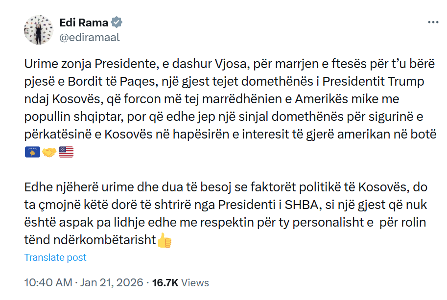 Kryeministri i Shqipërisë, Edi Rama, e ka uruar Presidenten e Kosovës, Vjosa Osmanin, për marrjen e ftesës nga Presidenti amerikan, Donald Trump, për t’u bërë pjesë e Bordit të Paqes.