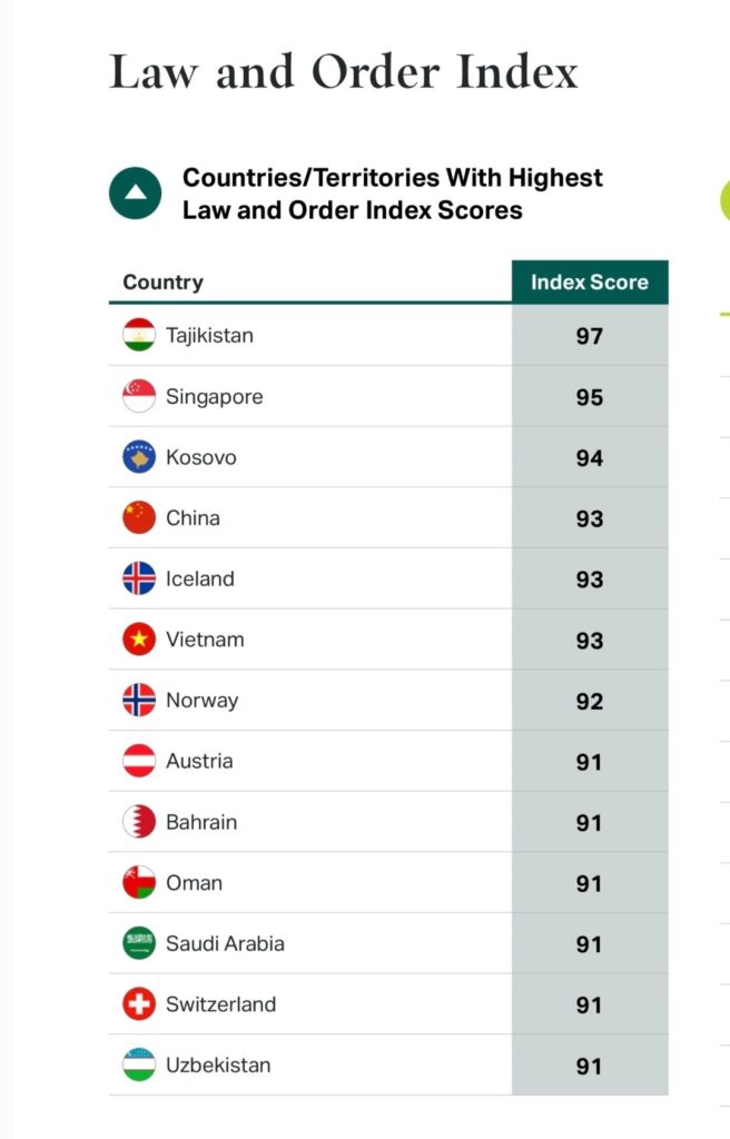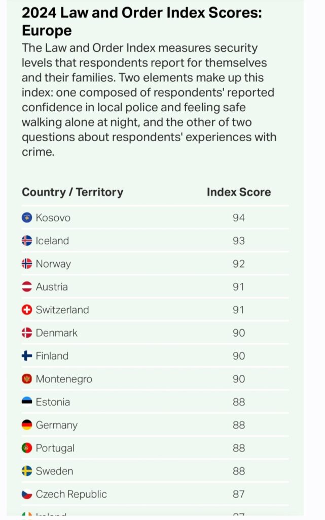 Sipas raportit, Kosova ka arritur rezultat 94 pikë nga 100 në Indeksin e Ligjit dhe Rendit, duke u renditur menjëherë pas Taxhikistanit (97 pikë) dhe Singaporit (95 pikë) si tre vendet më të sigurta në botë. Ky rezultat e bën Kosovën vendin më të sigurt në Evropë, duke lënë pas shtete të zhvilluara si Islanda, Norvegjia, Austria dhe Zvicra.