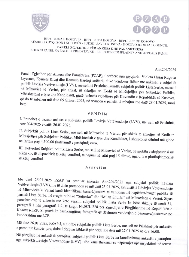 Paneli Zgjedhor për Ankesa dhe Parashtresa ka dënuar me 4 mijë e 500 euro Listën Serbe.