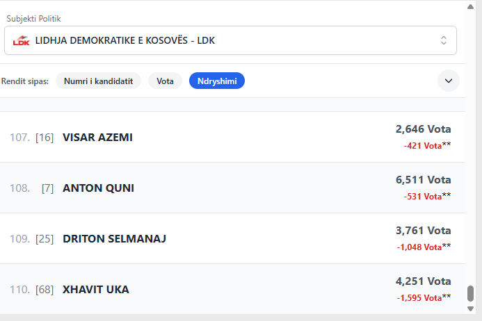 Pas LDK-së, lëvizja të mëdha në vota janë vërejtur edhe në LDK. Sipas të dhënave aktuale, Xhavit Uka nga kjo parti ka -1,595 vota më pak, pasuar nga Driton Selmanaj me 1,048 Vota, Anton Quni me 531 vota më pak, e Visar Azemi me 421 vota më pak.