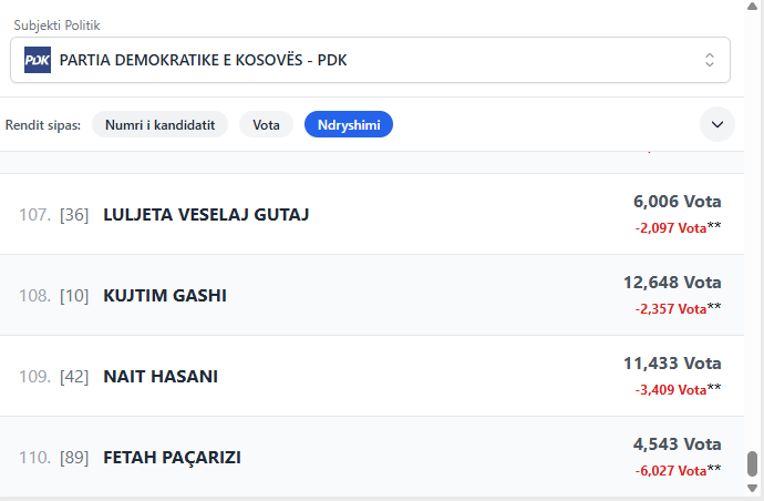 Dallime të dukshme janë vërejtur tek votat e disa kandidatëve të Partisë Demokratike të Kosovës.