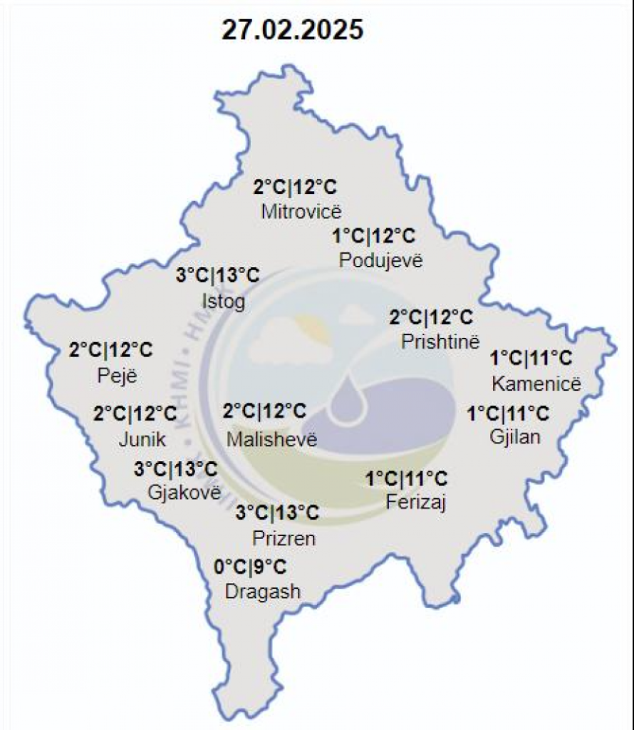 Sipas IHMK-së, temperaturat minimale do të lëvizin nga 0° C deri në 3° C, ndërsa ato maksimale nga 9° C deri në 13° C.