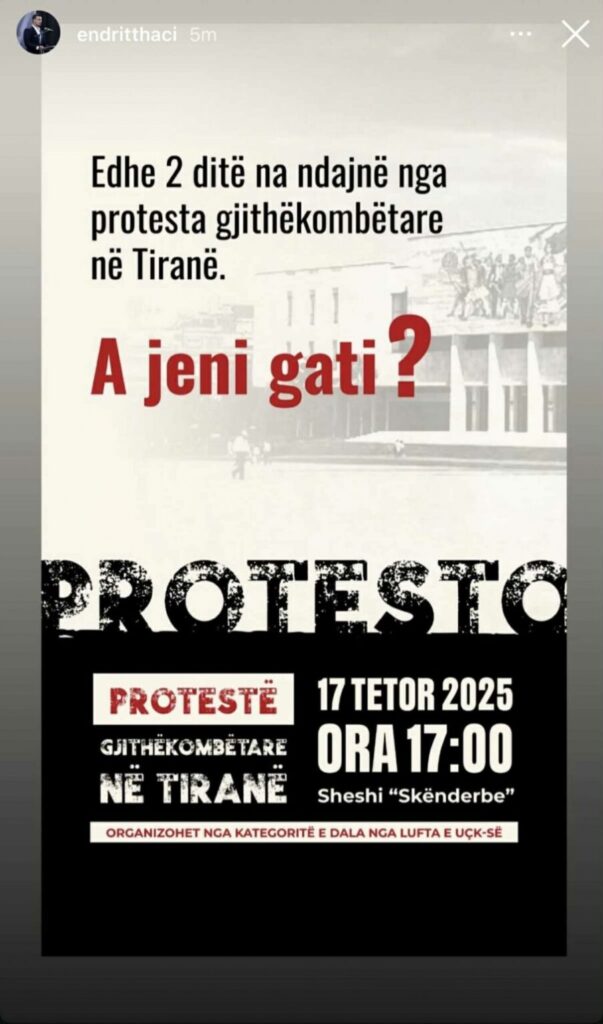 Djali i ish-presidentit Hashim Thaçi, Endriti, ka rishpërndarë thirrjen për protestën gjithëkombëtare, e cila do të mbahet të premten në Tiranë.