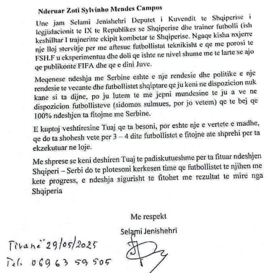 Ish deputeti Selami Jenisheri i ka drejtuar një letër trajnerit të Kombëtares Silvinjo.