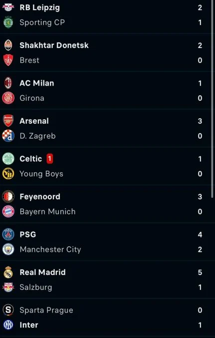 Në takimet e tjera, Celtic fitoi 1-0 me Young Boys, RB Leipzig mundi Sportuing 2-1 dhe Brest u mposht 2-0 në transfertë nga Shakhtar.