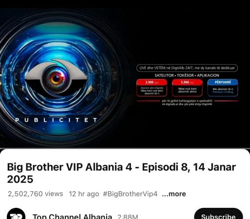 Big Brother VIP Albania 4 ka arritur një tjetër rekord shikueshmërie në platformën YouTube, duke regjistruar deri në 360 mijë shikues.