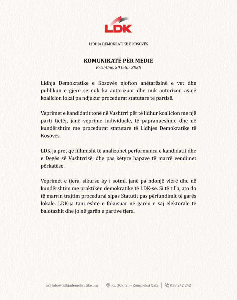 Në një komunikatë për media, LDK thekson se veprimet e kandidatit të saj në Vushtrri për të lidhur koalicion me një parti tjetër janë individuale, të papranueshme dhe në kundërshtim me rregullat e brendshme të partisë.