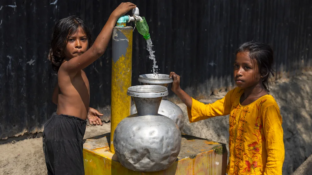 Dy vajza marrin ujë nga një pompë në Shyamnagar të Bangladeshit. Në rajonin e varfër Sundarbans, kjo është një punë e përditshme.