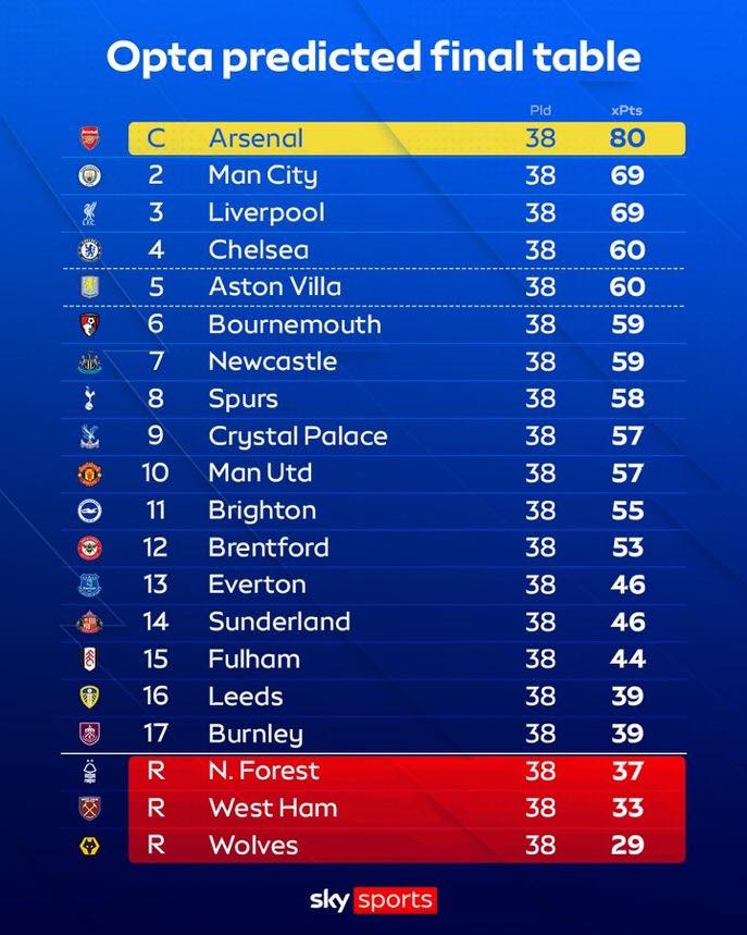 Sipas tyre, Arsenali do të shpallet kampion i Anglisë me 80 pikë, duke lënë pas Manchester Cityn dhe Liverpoolin, që përfundojnë me nga 69 pikë secili.