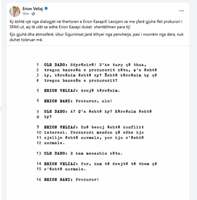 Ne mesazhin e tij Veliaj shkruan: “Ky është një nga dialogjet në thertoren e Erion Kasapit! Lexojeni se me çfarë gjuhe flet prokurori i SPAK-ut, aq të ulët sa edhe Erion Kasapi duket xhentëllmen para tij!