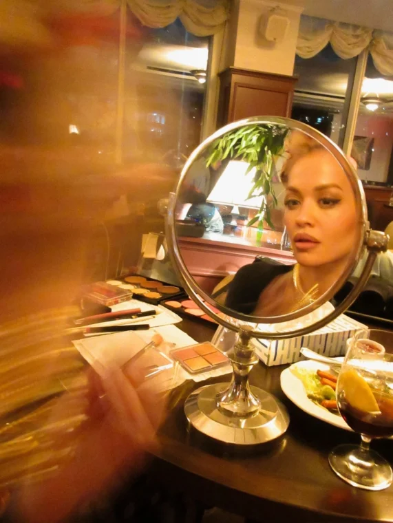 Në imazhet e publikuara, Rita shfaqet me një pamje frymëzuar nga eleganca klasike e viteve ‘50 — me flokë të valëzuar, grim të rafinuar me ‘eyeliner’ të theksuar dhe buzë rozë të buta.